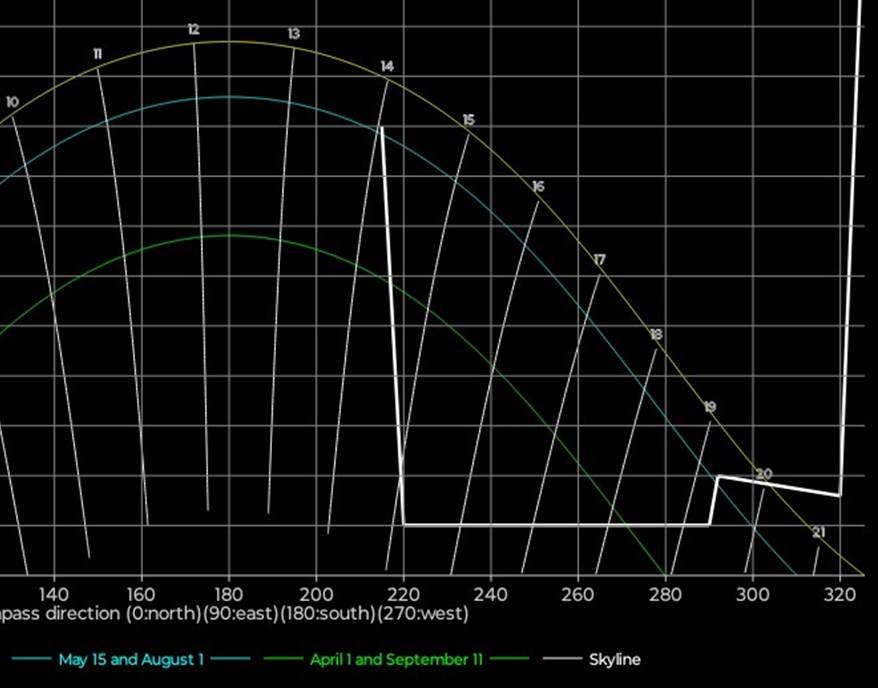 Den hvite streken viser vinkelhøyden for stedets ‘skyline’. I eksemplet